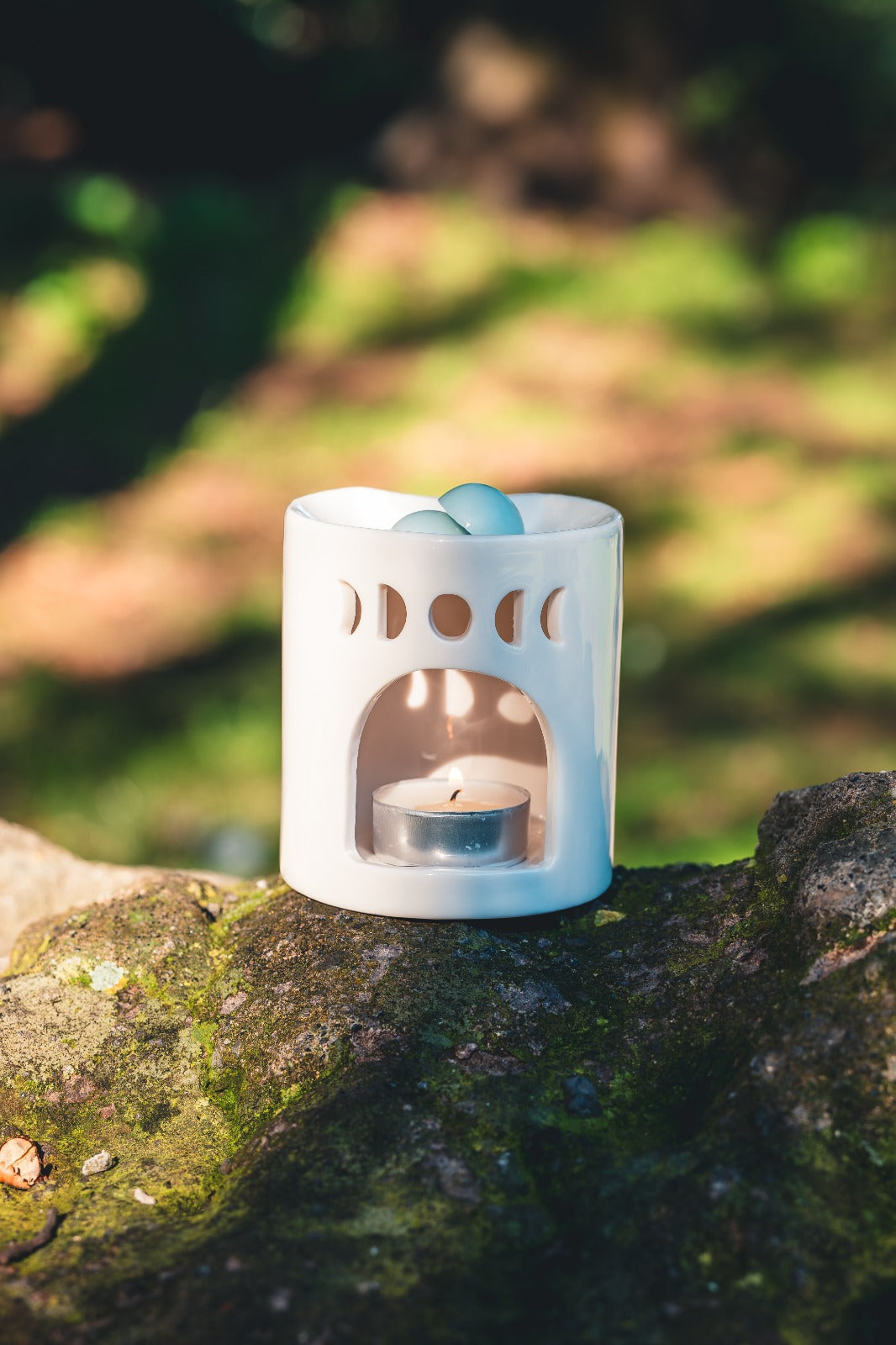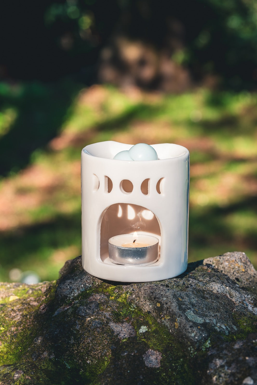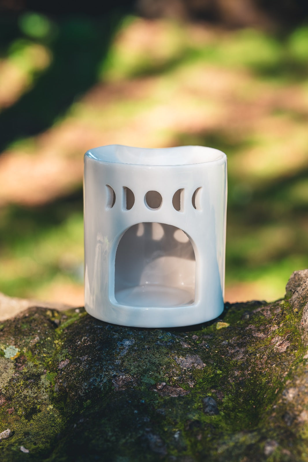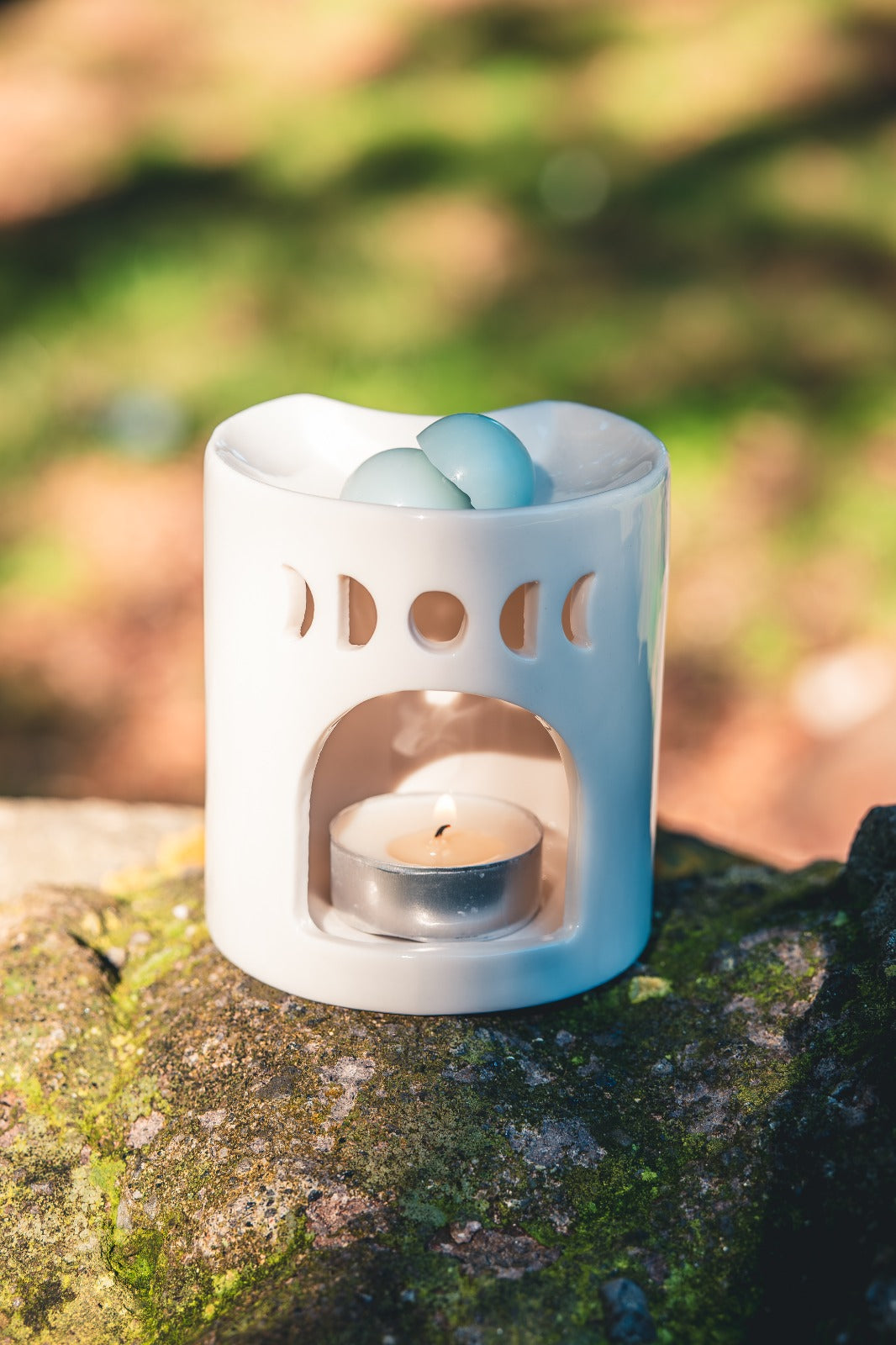 Il Bruciatore mezzaluna Bianca scalda lentamente le cialde profumate e lascia che le fragranze di Armonie di Cera si diffondano nella stanza, creando un’atmosfera delicata e luminosa.
